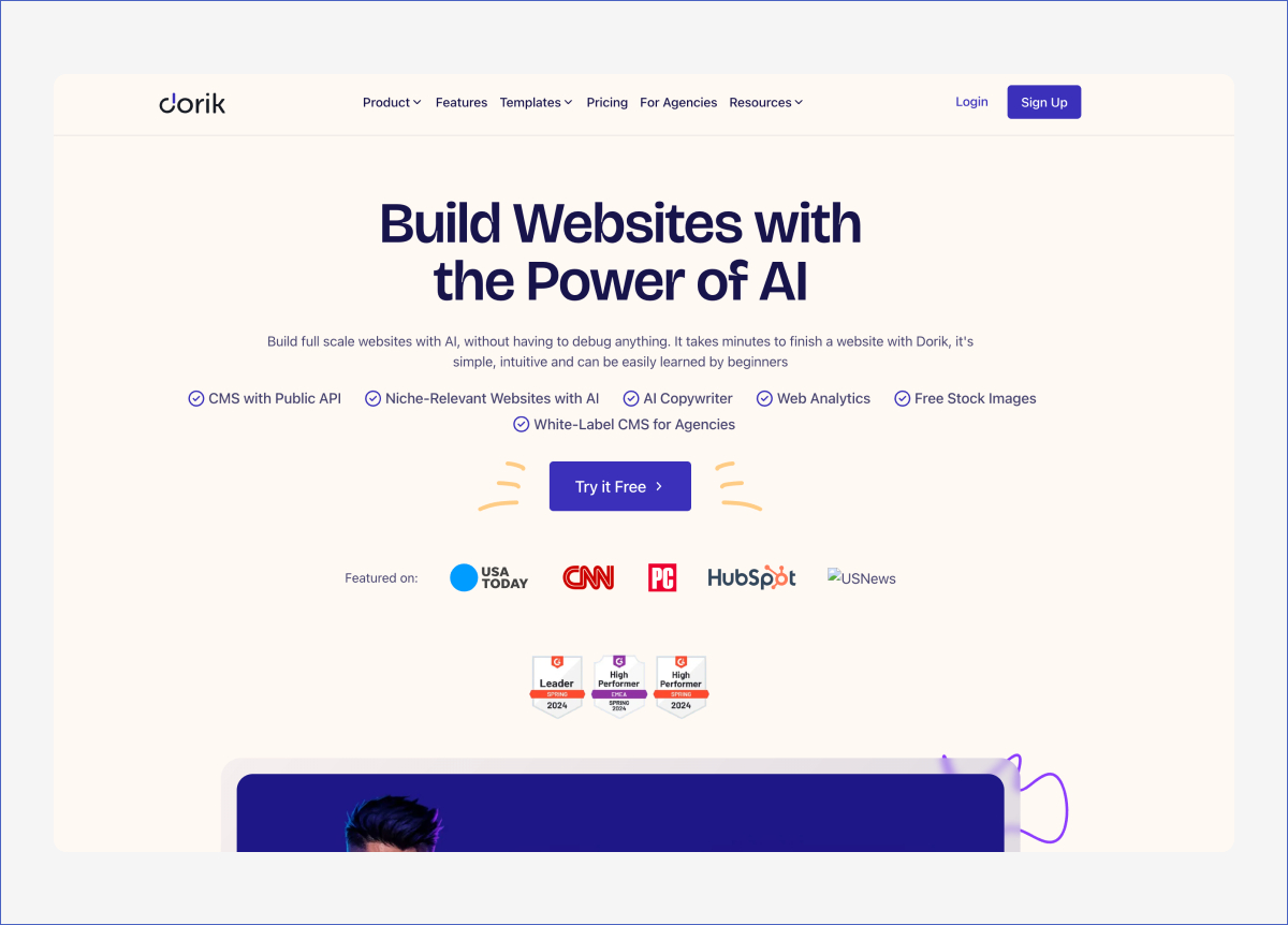 Dorik — это конструктор сайтов с упором на простоту и быстрый запуск. В нем есть AI-режим, который генерирует сайт по текстовому описанию. Подходит для тех, кто хочет получить аккуратный лендинг без сложной настройки.