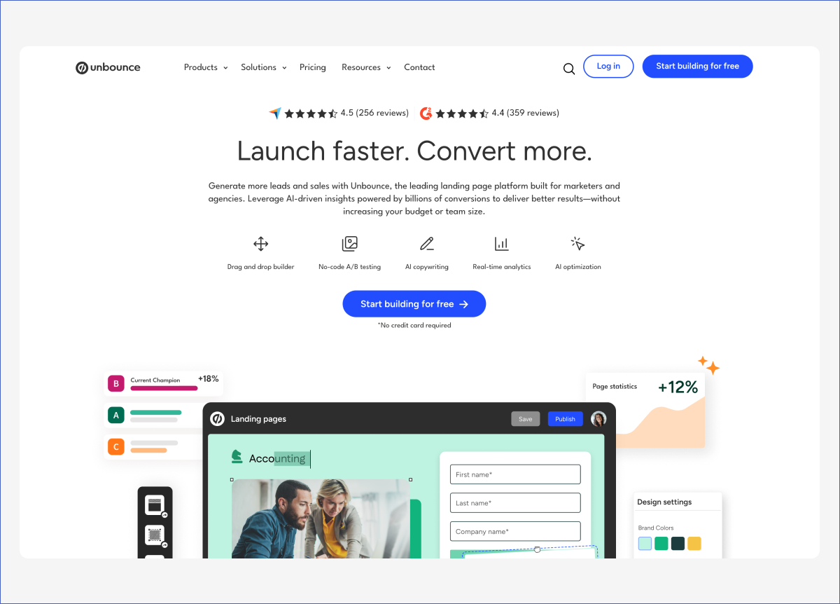 Unbounce — это ИИ-инструмент для создания лендингов с упором на конверсию. В отличие от обычных генераторов сайтов, он не просто собирает страницу, а сразу ориентируется на маркетинговый результат.