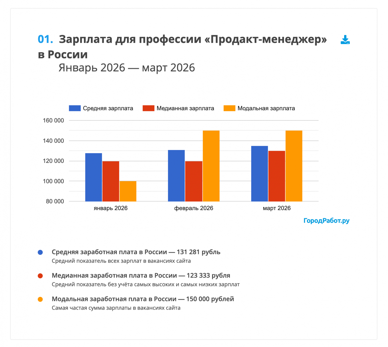 По данным ГородРабот.ру, средняя зарплата продакт-менеджера в России — 131 281 рубль.