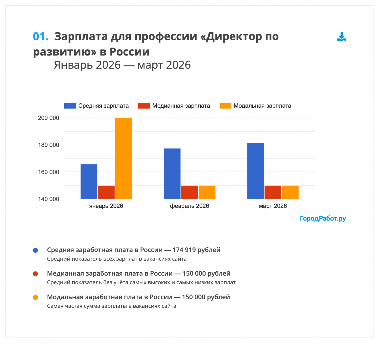 По данным ГородРабот.ру, средняя зарплата директора по развитию в России — 174 919 рублей.