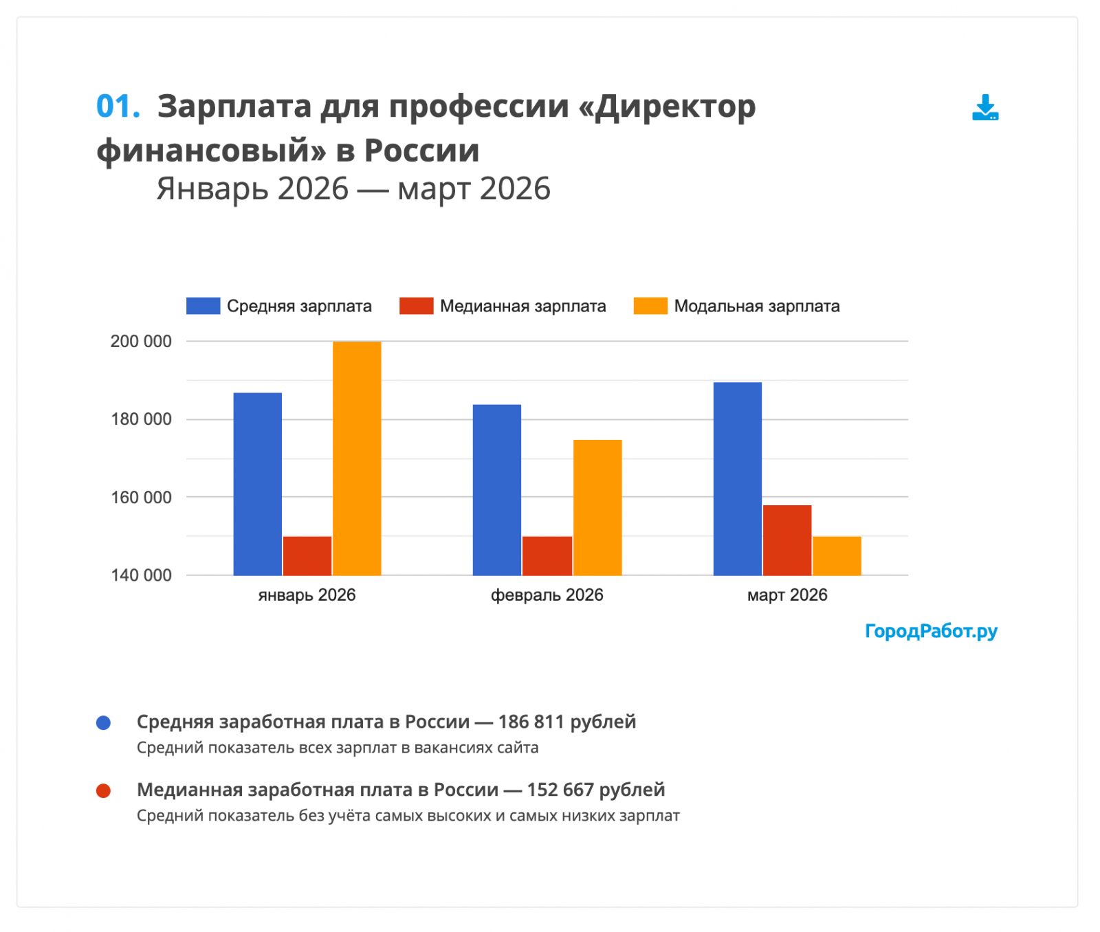 По данным ГородРабот.ру, средняя зарплата CFO в России — 186 811 рублей.