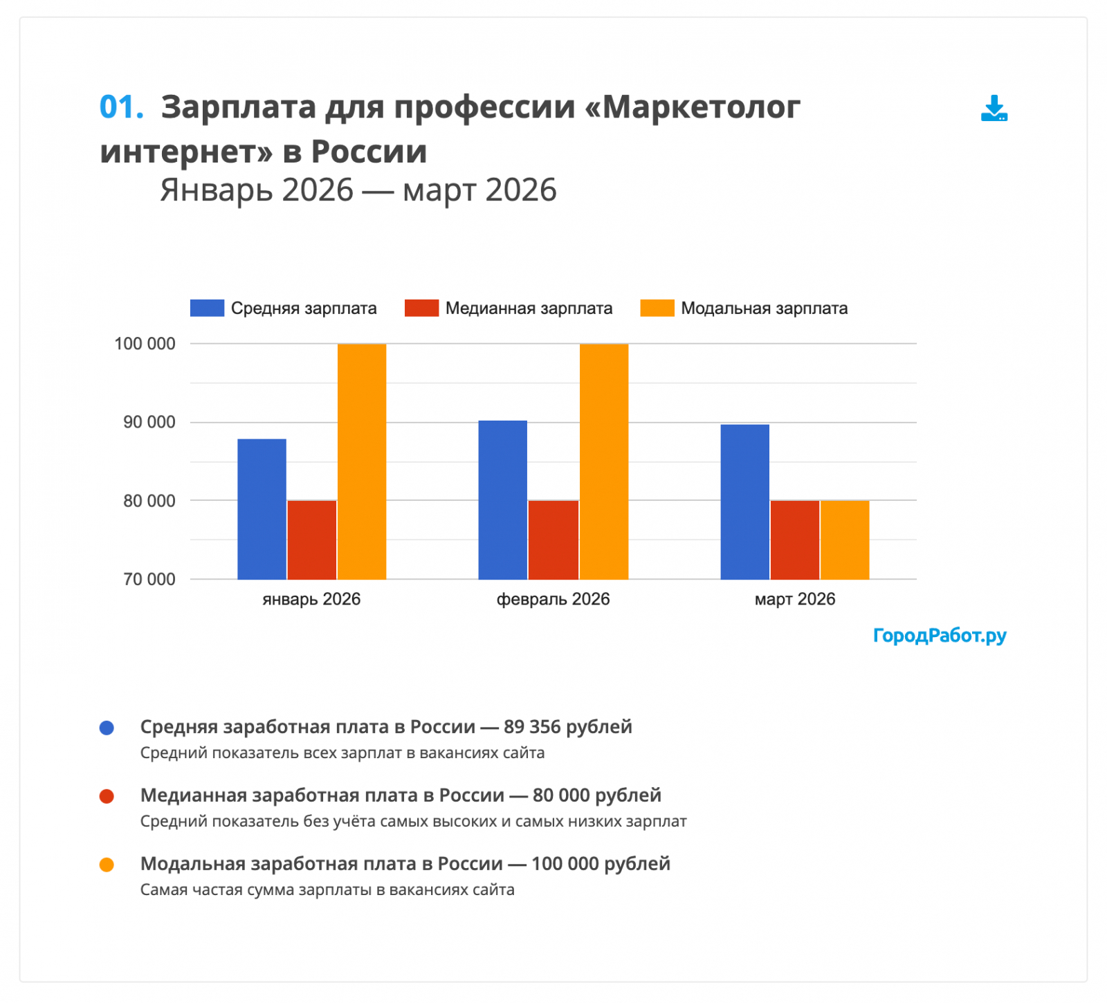 По данным ГородРабот.ру, средняя зарплата интернет-маркетолога в России — 89 356 рублей.
