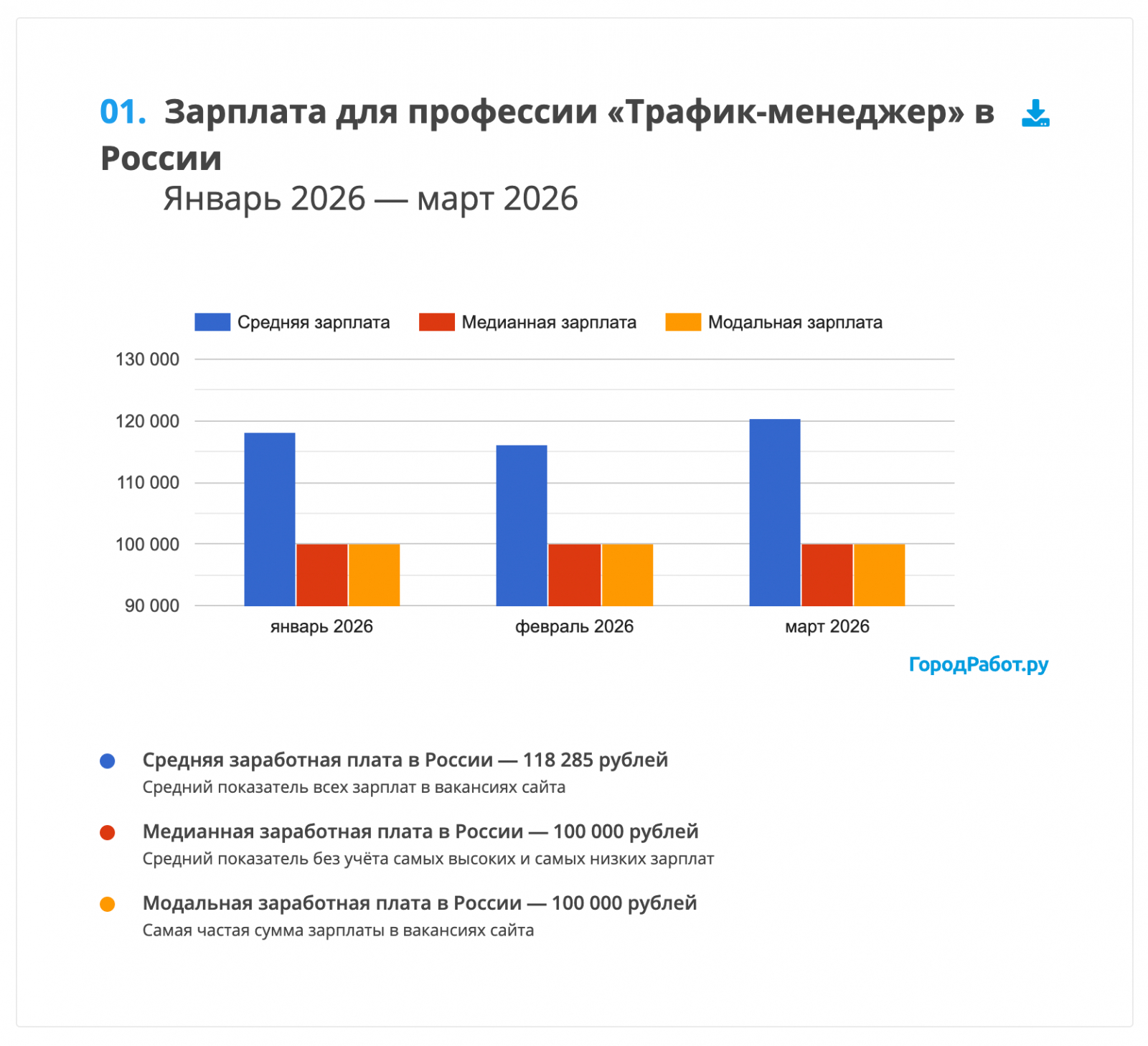 По данным ГородРабот.ру, средняя зарплата трафик-менеджера в России — 118 285 рублей.