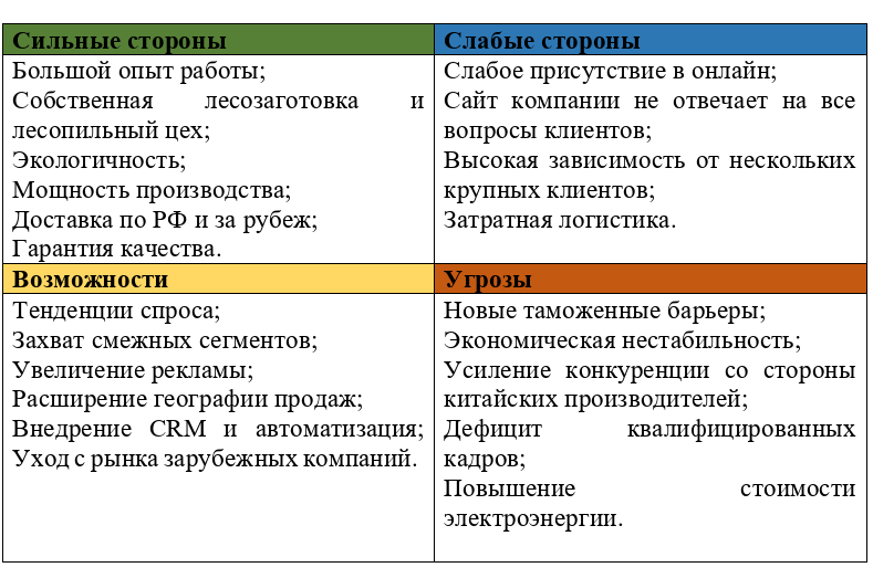 В результате проведенного анализа обязательно дается вывод и ключевые рекомендации для предотвращения угроз и использования возможностей. Например в данной ситуации стоит нанять маркетолога и запустить системное продвижение, чтобы диверсифицировать клиентскую базу компании, усилять маркетинг на основе собственных преимуществ и работать с сайтом и CRM.