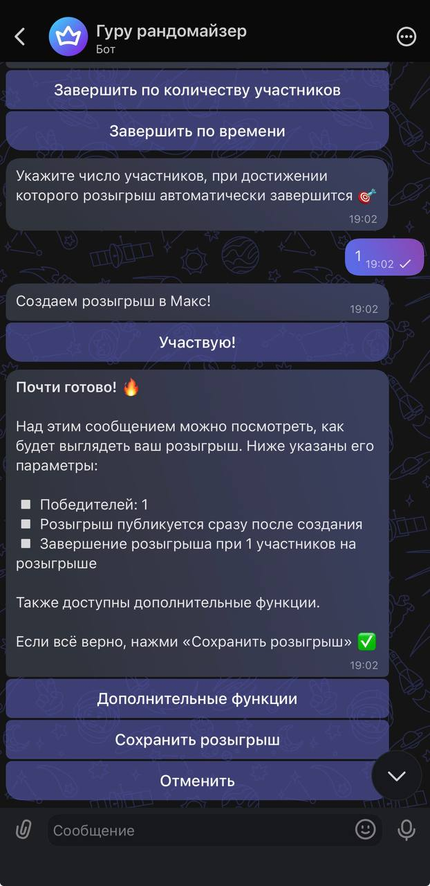 GuruRandom (Гуру рандомайзер) — бесплатный бот для проведения конкурсов. На данный момент это единственный полноценный инструмент для розыгрышей в MAX. Конкурентов буквально нет.