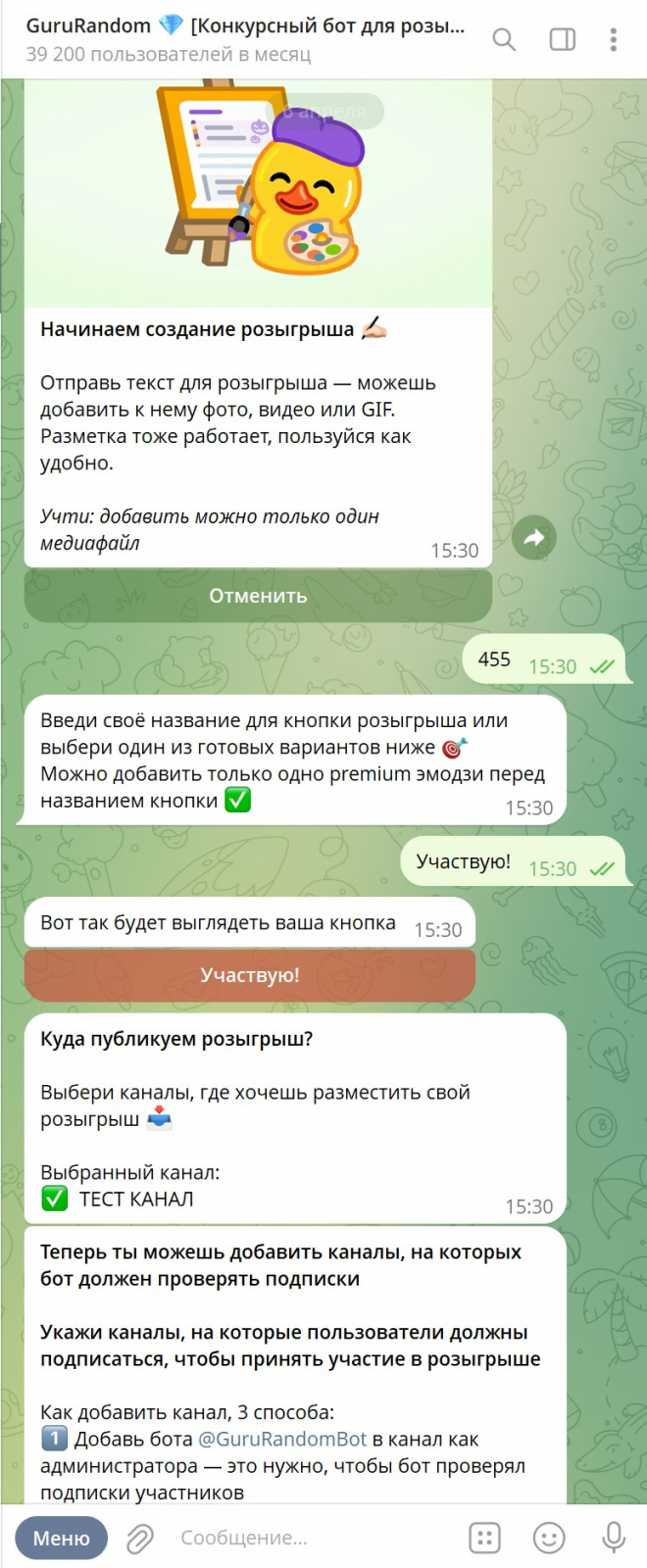 Главная фишка GuruRandom — кроссплатформенная проверка подписок. Создаёшь розыгрыш в Telegram → ставишь условие «подписка на канал в MAX» → участники подписываются → бот проверяет автоматически через API.