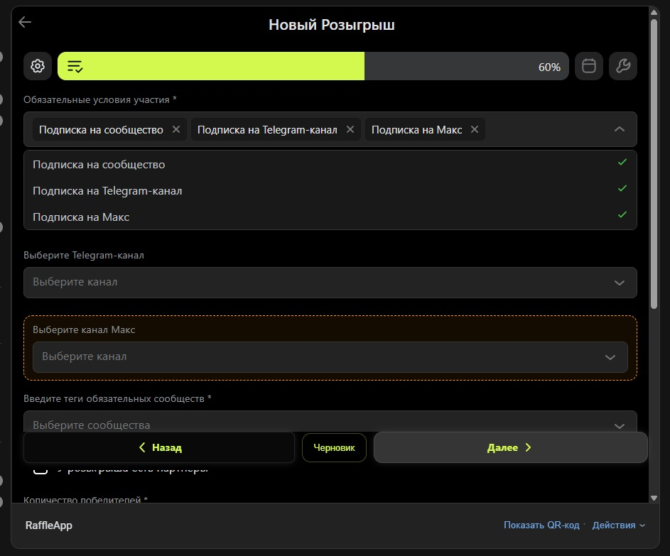 Розыгрыши — один из немногих способов, который уже сейчас работает. Вкладываешь 3-5 тысяч рублей в приз — получаешь сотни реальных подписчиков. А если подключить кроссплатформенность — подписчиков получаешь не только в MAX, но и в Telegram с ВКонтакте. Одним конкурсом.
