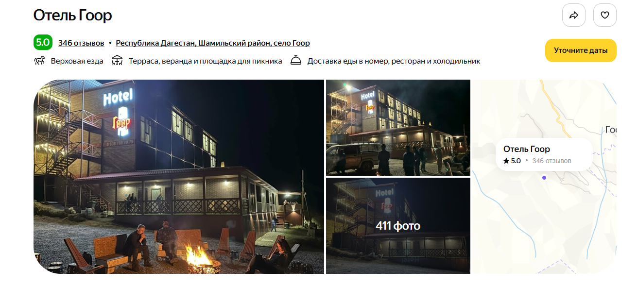 Горная жемчужина списка в Шамильском районе у знаменитых Гоорских башен. Из окон открывается вид на хребет и долину Аварского Койсу, а через дорогу — заброшенный аул, «Страна башен», Девичья скала, которую называют дагестанским Языком Тролля. Отель построен в 2022 году и располагает 22 номерами с кондиционерами, отоплением, телевизорами и собственной террасой. На территории — ресторан с блюдами местной кухни, зона для мангала, беседка. Хозяева помогают с организацией экскурсий к башенному комплексу, музею народного искусства и ремесел. Трансфер от аэропорта и вокзала обсуждается отдельно.