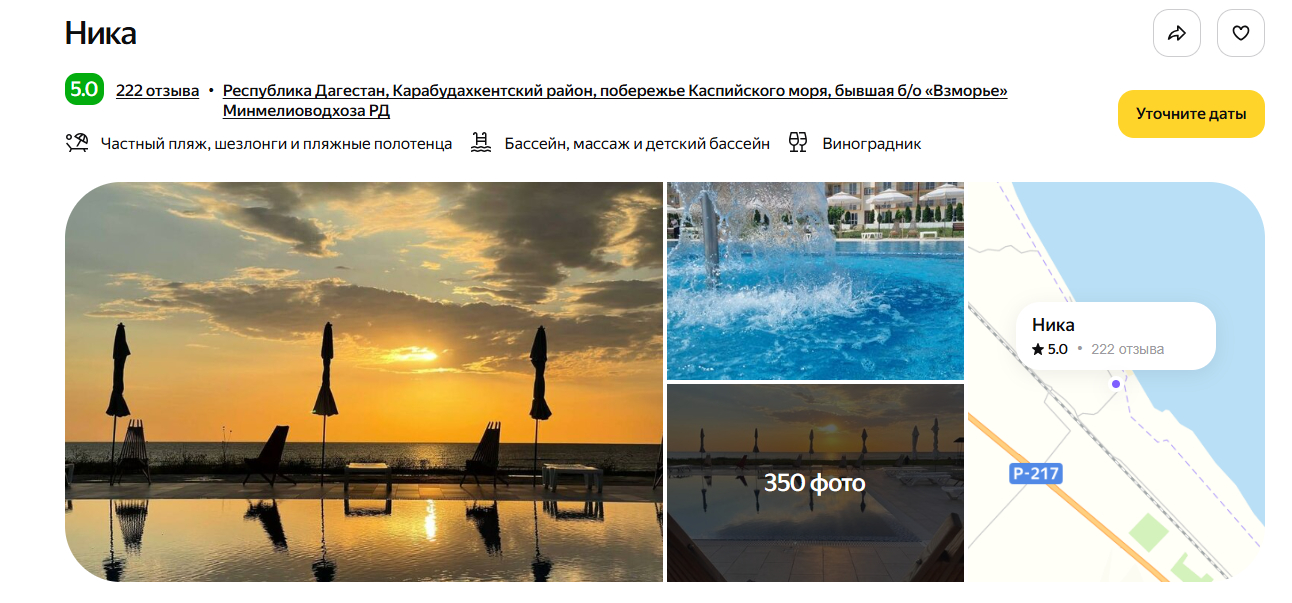 Пляжный комплекс на побережье Каспия в Карабудахкентском районе, расположенный на месте бывшей базы отдыха «Взморье». 16 номеров в корпусе, оборудованный пляж с бунгало, шезлонгами и сап-бордами, большой подогреваемый бассейн с подсветкой и отдельный детский. Для юных гостей — игровая комната, детская анимация, кроватки и коляски напрокат, детское меню. На территории есть виноградник, тренажерный зал, теннисные столы, площадки для бадминтона и волейбола, мангал для шашлыка. Рядом — Каспийское море, горы и свежий воздух: редкое сочетание для одной локации.