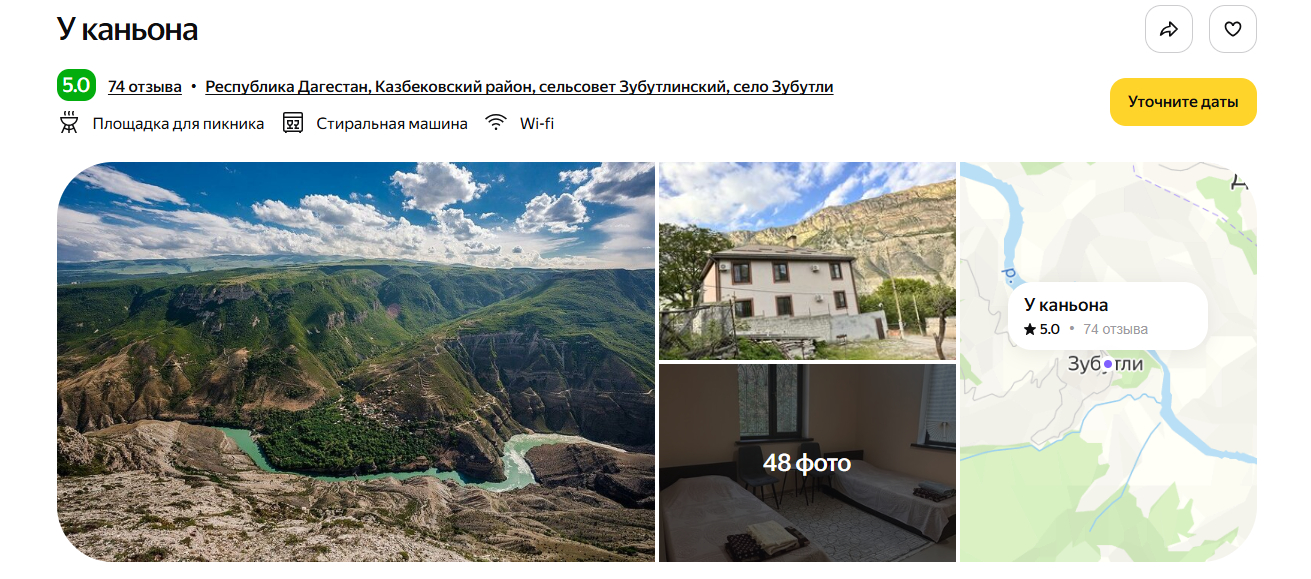 Семейный гостевой дом в селе Зубутли Казбековского района на берегу Сулакского каньона: одной из главных природных достопримечательностей Дагестана. Шесть номеров с кондиционером, общая кухня, площадка для барбекю, гладильные принадлежности, стиральная машина и сушилка. Хозяин встречает гостей лично, организует трансфер до аэропорта, вокзала и торгового центра. Здесь же — катание на лодках и катерах по каньону. Рядом — лодочный причал и родниковые источники. В отзывах гостей постоянные мотивы: «добрейшей души человек», «рекомендации по горным маршрутам», «искупались в каньоне, попили горной воды».
