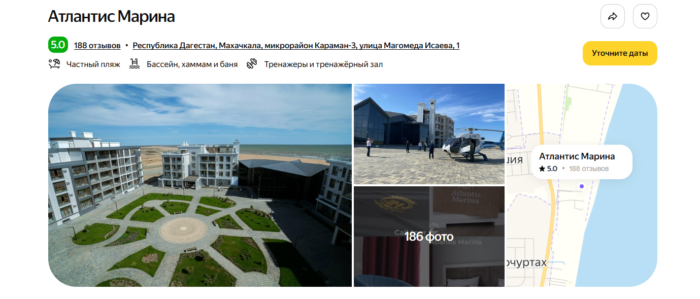 Для спа-отдыха и оздоровительных поездок стоит рассматривать Каспийск с его спа-отелем Арт Холл и Махачкалу с отелем 1000 и 1 Ночь — оба располагают полноценной спа-инфраструктурой с хаммамом и массажными процедурами. Если в приоритете современный формат с новым номерным фондом — на побережье Махачкалы работает Атлантис Марина, но при бронировании стоит уточнять этап завершения строительства и читать свежие отзывы.