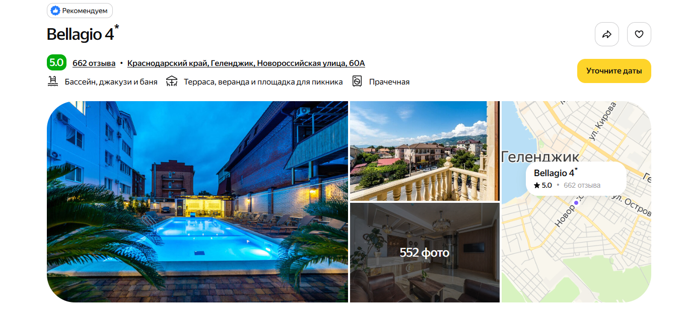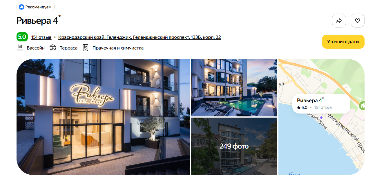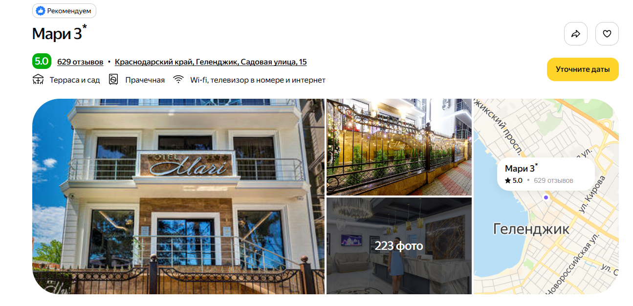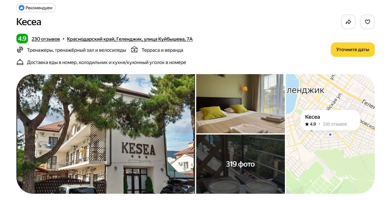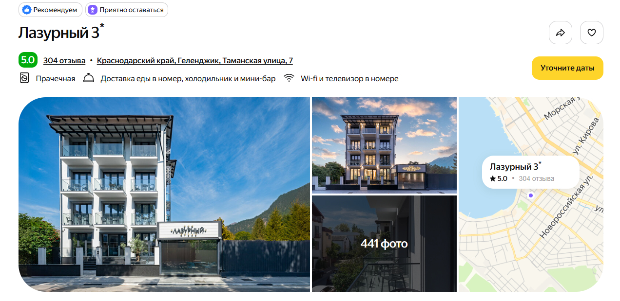 Отель построили в 2020 году, поэтому номера выглядят свежими, а сантехника — современной. До моря идти 10 минут неспешным шагом. Рядом — набережная, магазины «Магнит» и «Пятёрочка». Гости почти единогласно хвалят завтрак — готовят вкусно и разнообразно. На территории расположились открытый бассейн с подогревом, обустроены мангальные зоны.