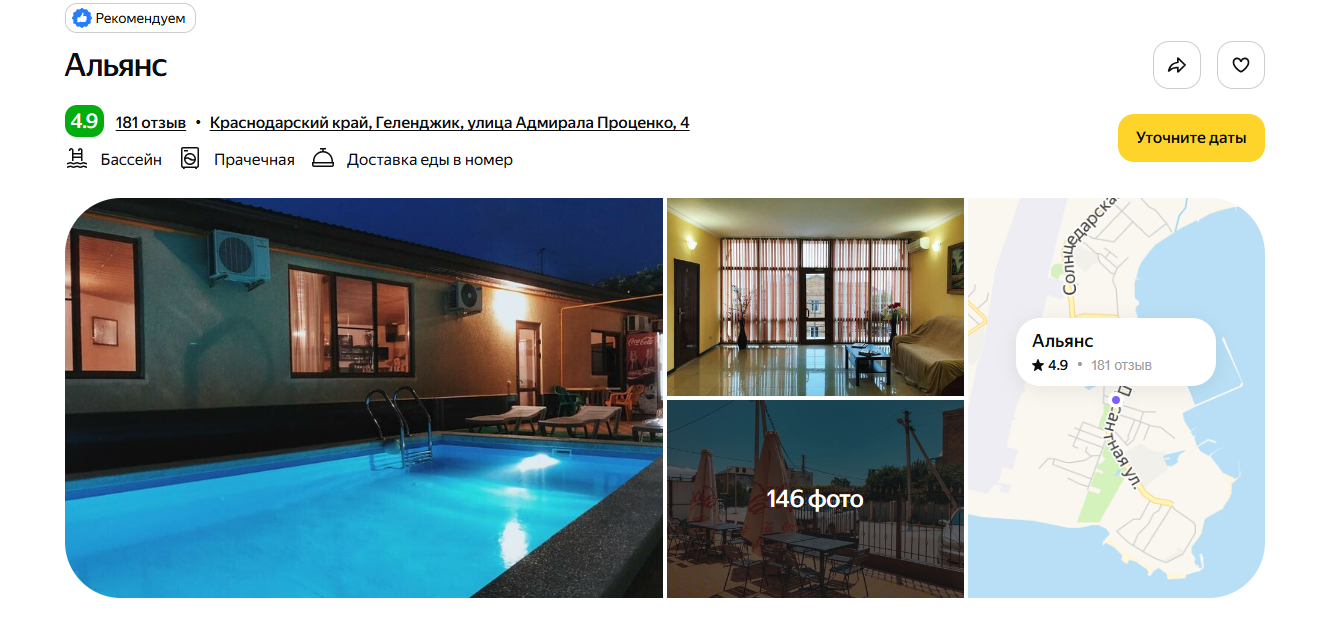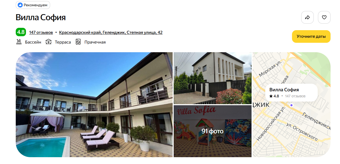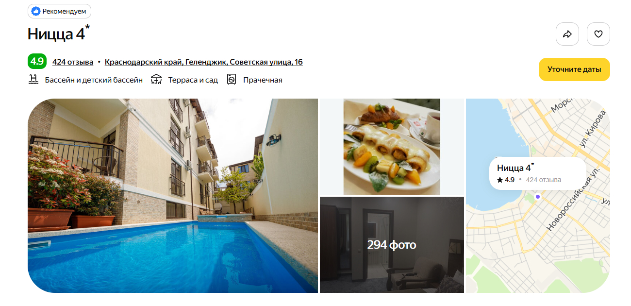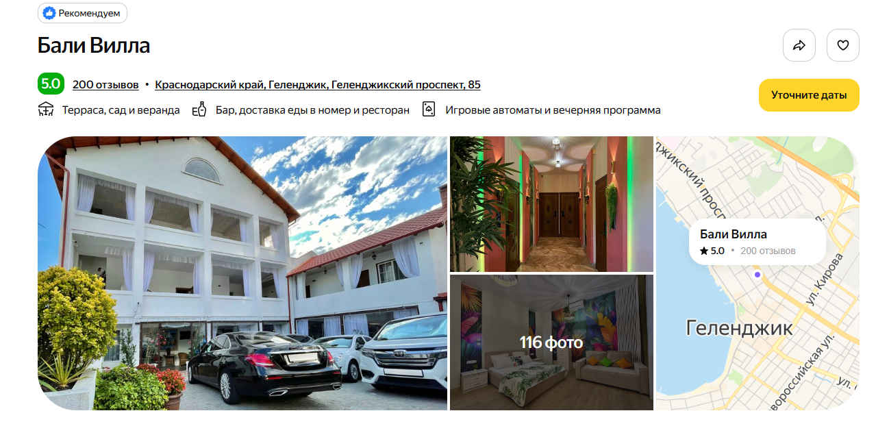 Отель построили в 2020 году, поэтому номера выглядят свежими, а сантехника — современной. До моря идти 10 минут неспешным шагом. Рядом — набережная, магазины «Магнит» и «Пятёрочка». Гости почти единогласно хвалят завтрак — готовят вкусно и разнообразно. На территории расположились открытый бассейн с подогревом, обустроены мангальные зоны.