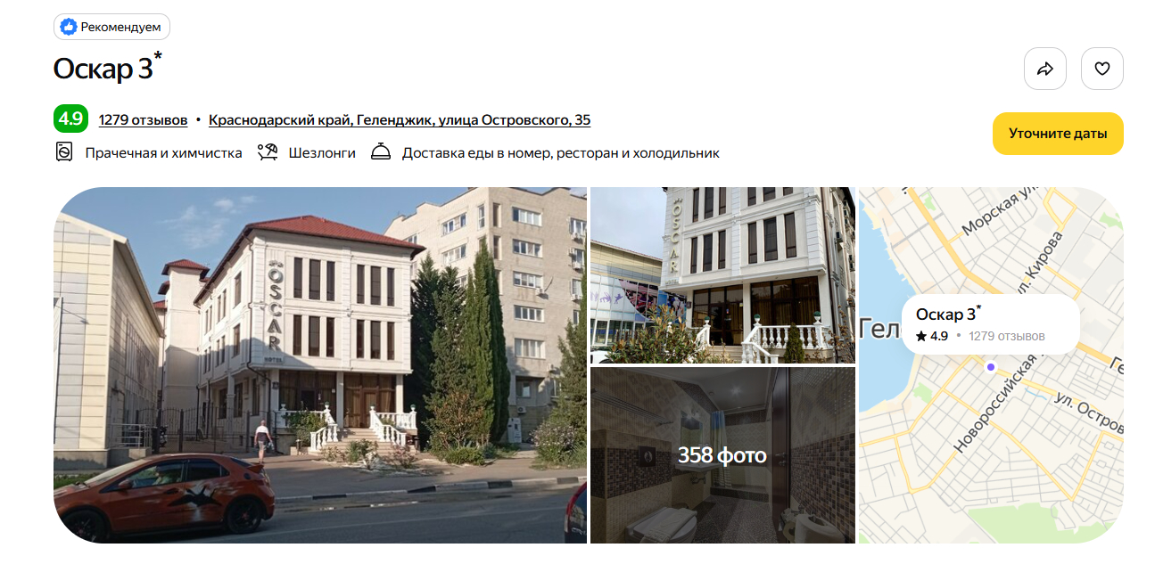 Шведский стол уже включён в цену — не придётся с утра искать кафе. До набережной полкилометра, рядом пляжи «Сады морей» и «Багамы». Вокруг столовые, бургерные и кавказские рестораны, так что голодным не останетесь. Отель пускает с собаками за отдельную плату.