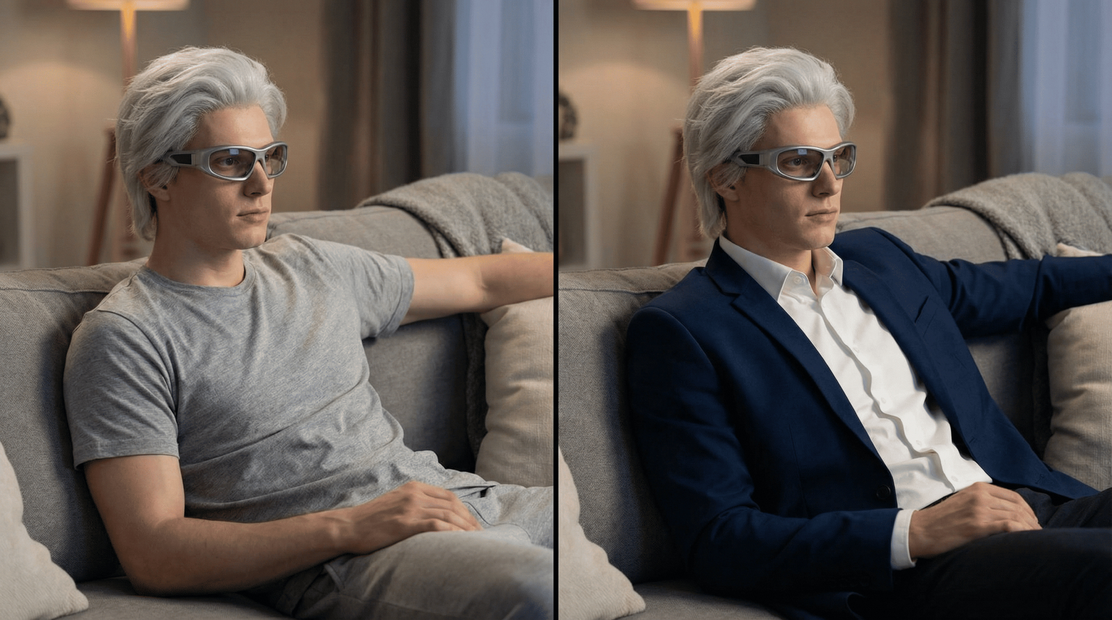 Замени всю одежду на человеке на образ в стиле тихой роскоши: бежевое кашемировое пальто, белая рубашка с воротником, прямые брюки цвета экрю. Обувь — лоферы. Сохрани внешность, позу и фон. Не меняй лицо.