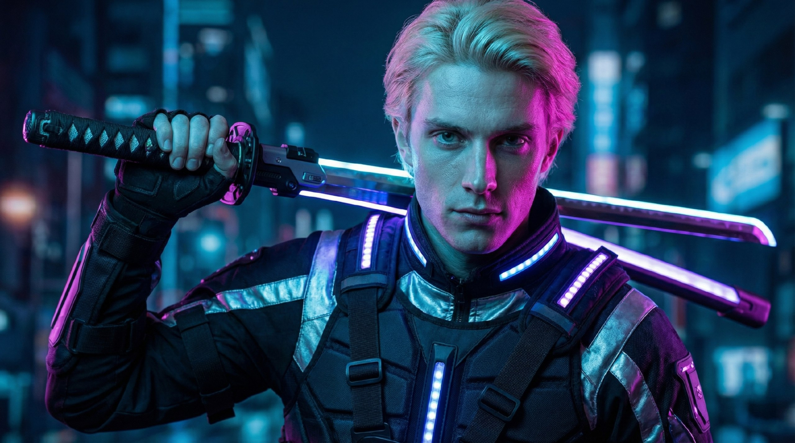 26. Neon Samurai Style: The man from the reference in modern samurai techwear, holding a katana. High contrast, neon rim light, sharp facial details, maintaining his exact look and skin texture.
