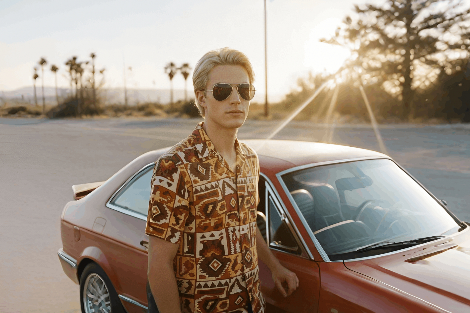 23. Retro 70s Rockstar: The man from the reference with a vintage patterned shirt and aviators, standing by a classic car. Warm film aesthetic, sun flares, grainy texture, keeping his identity and natural skin look.