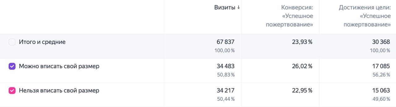Наша команда mercy.agency давно работает с соцрекламой для НКО и знает, как любые детали могут влиять на конверсию. В результате эксперимента было доказано, что возможность указать свою сумму пожертвования поднимает конверсию на 12%. Ниже поделимся, как мы это проверили на 67 тысячах посетителей, и почему теперь все наши клиенты используют именно такой подход.