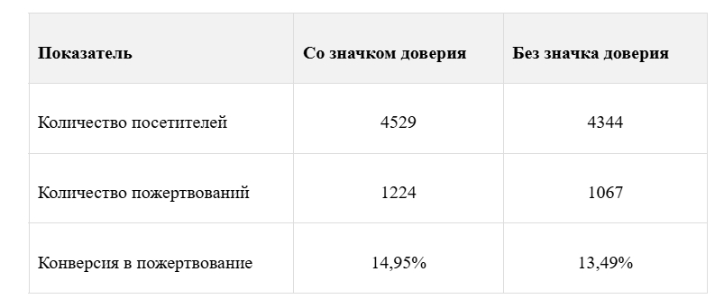 Вывод: значок доверия принёс 157 дополнительных пожертвований — это на 10% больше. При среднем чеке в 500 руб. - это дополнительные 78 500 руб.