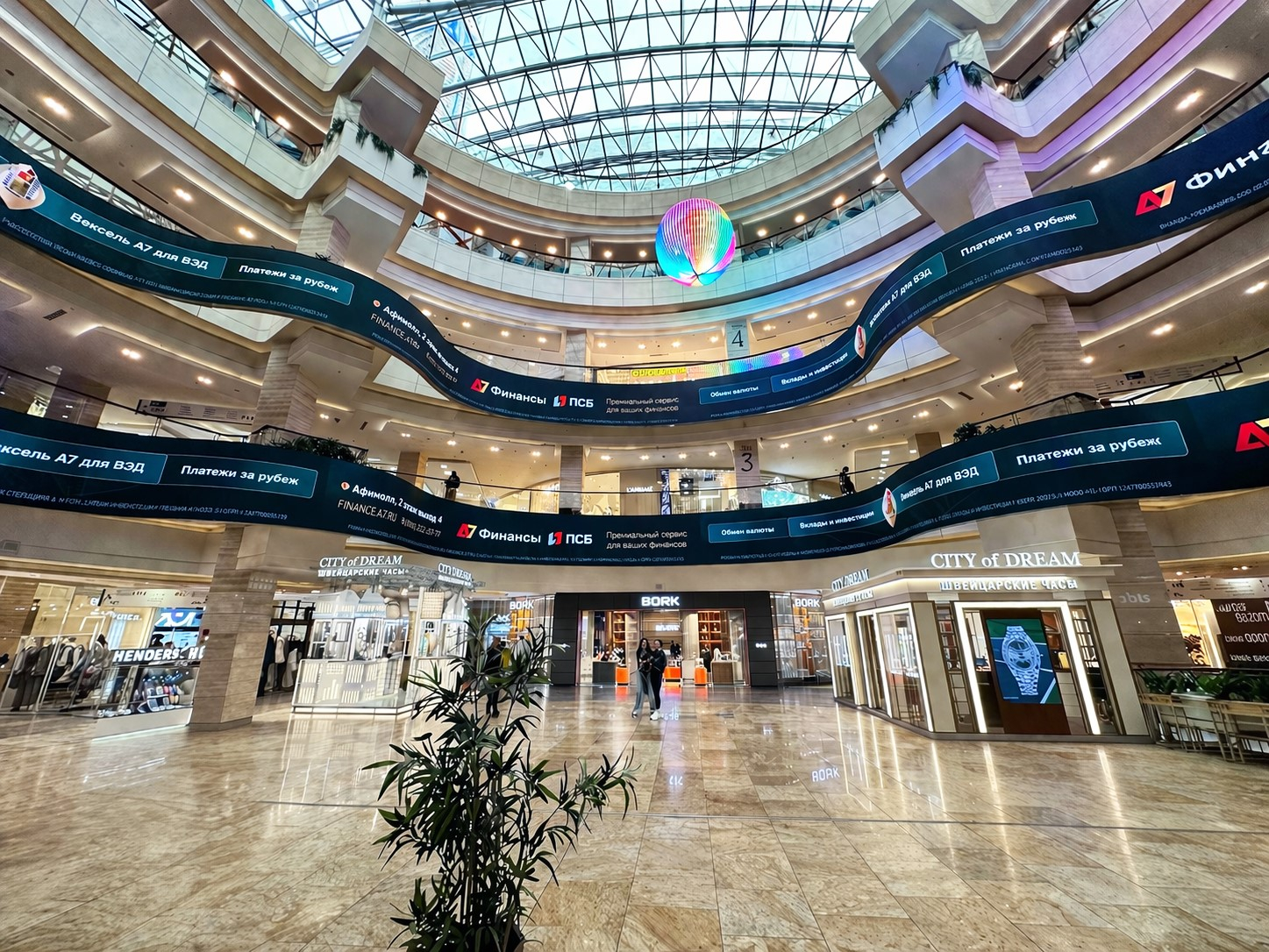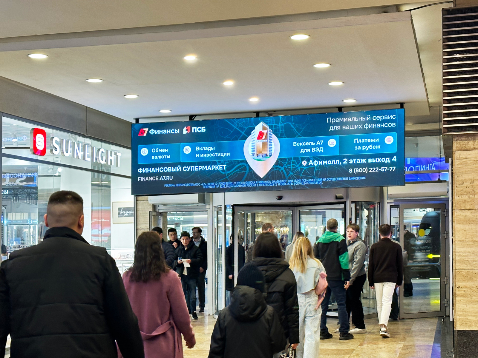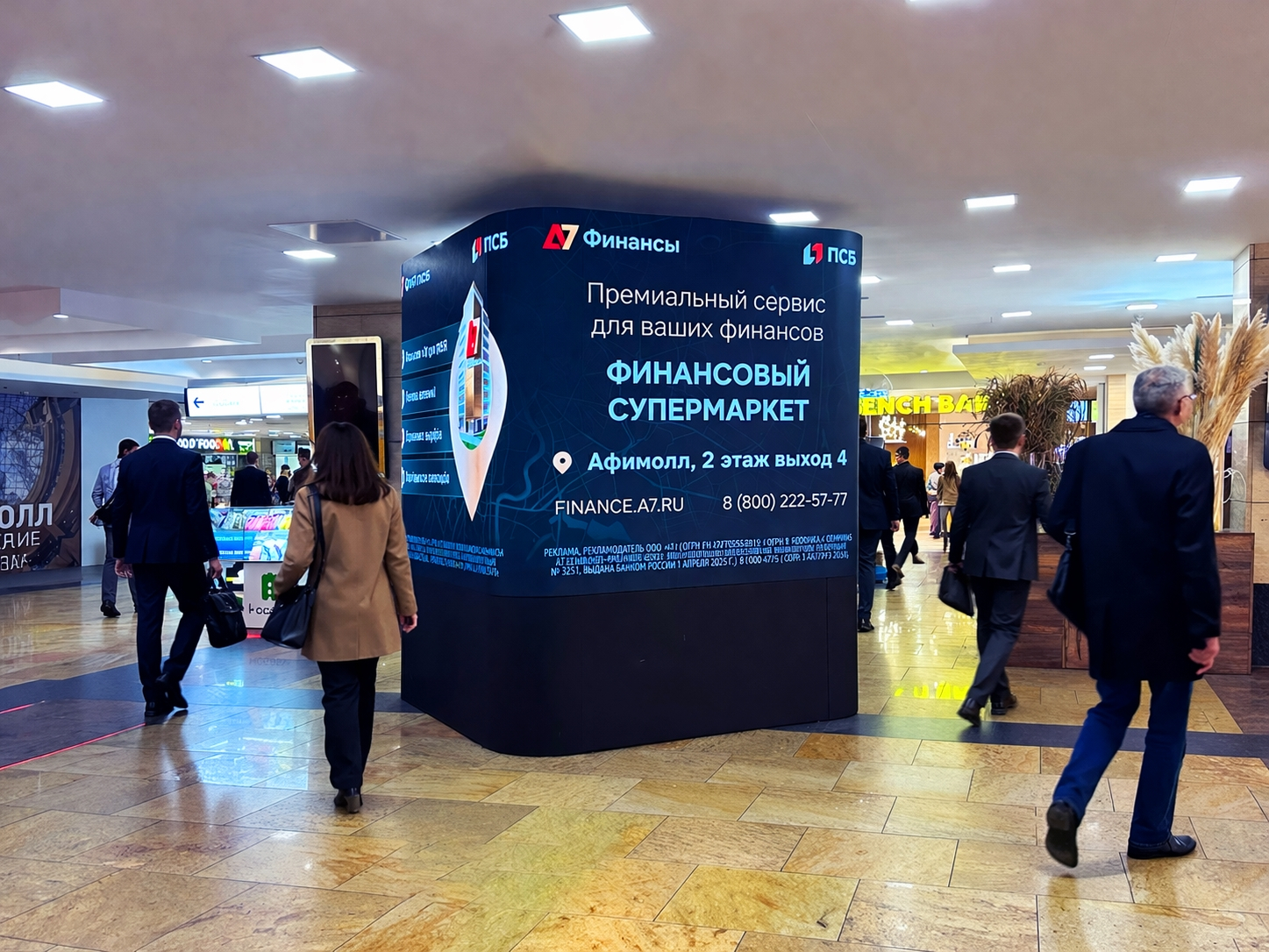 В рамках этой инфраструктуры ХАЙЛАЙТС реализовал размещение компании A7 в торговом центре Афимолл. Проект стал частью комплексной коммуникации бренда, объединяющей маркетинг, PR и клиентский сервис. Афимолл Сити — один из ключевых деловых и потребительских хабов столицы, объединяющий офисную аудиторию, предпринимателей и платежеспособных частных клиентов. Присутствие в этой локации позволяет A7 одновременно решать несколько стратегических задач: