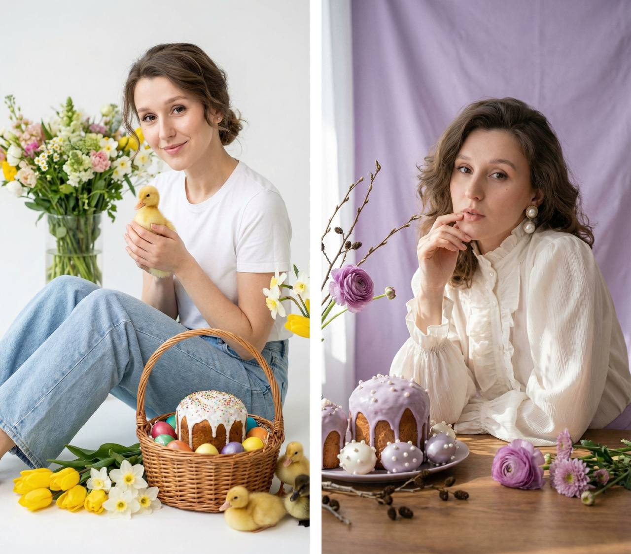 Гиперреалистичное фото девушки с референса, 100% сохранение черт лица, костной структуры и живой текстуры кожи. Студийный портрет на белом фоне. Девушка сидит с доброй улыбкой и нежно держит в руках маленького пушистого желтого утенка. Одета в светло-голубые широкие джинсы и белую футболку. Рядом с ней на полу стоит плетеная корзина, в которой лежит пасхальный кулич с белой глазурью и цветной посыпкой, а также несколько разноцветных пасхальных яиц. Вокруг нее разбросаны яркие весенние цветы: желтые тюльпаны, белые нарциссы. Рядом бегают маленькие желтые утята. На заднем плане стоит большая стеклянная ваза с пышным букетом таких же весенних цветов. Прическа: волосы собраны в мягкий низкий пучок, естественные пряди обрамляют лицо — видна естественная линия роста у лба и висков, выбивающиеся тонкие волоски, легкая пушистость, глубина в тенях. Макияж: нежный профессиональный макияж, длинные выразительные ресницы, естественные оттенки, свежее сияние кожи. Кожа с макияжем, видимыми порами, естественным блеском — живая, без пластиковой гладкости. Живой взгляд: добрый спокойный взгляд в камеру, видимые поры вокруг глаз, глубина радужки с мягкими естественными бликами, отдельные волоски бровей. Естественные губы: естественный оттенок с лёгкой текстурой бальзама, четкие линии с легкой асимметрией, реалистичные тени в уголках, легкая улыбка. На носу видны поры и мягкий блик.Освещение: мягкое естественное, создающее теплую и светлую атмосферу, без жестких теней. Цветовая гамма пастельная, бежевая, ярко-желтая и пасхальные акценты.Композиция: профессиональное студийное фото, высокая детализация, малая глубина резкости, мягкий фокус на фоне. Резкий фокус на глазах, утенке и пасхальной корзине. Объектив 85mm, f/1.8, ultra realistic, natural skin texture, soft background blur, 8k resolution, high detail.
