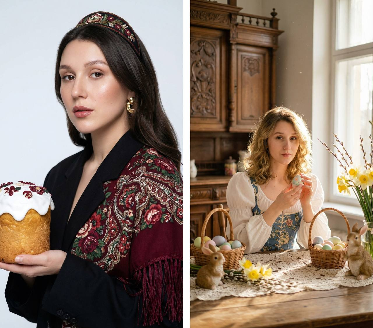 Не меняй внешность с фото . Крупный портрет молодой женщины в винтажном cottagecore платье — белая блуза с пышными рукавами и корсет с мелким голубым цветочным рисунком; она сидит за деревянным столом с кружевной скатертью и нежно держит в ладонях пасхальное яйцо, вокруг несколько плетёных корзин с пастельными расписными яйцами, керамические зайчики и букет нарциссов с веточками вербы; интерьер — тёплая деревенская кухня с резным старинным буфетом на заднем плане и большим окном справа, через которое идёт мягкий рассеянный дневной свет с лёгким золотистым оттенком и контровым свечением на вьющихся светлых волосах; композиция вертикальная, субъект немного смещён влево от центра, передний план с корзинами и фигурками создаёт глубину, лёгкая пыльца в воздухе для уюта; настроение спокойное, ностальгическое, уютное, пасторальное; стиль — кинематографичная пленочная фотография с мягкой фокусировкой, пастельной цветовой палитрой и тонкой зернистостью (Kodak Portra vibe); параметры камеры: портретный объектив 50mm, диафрагма f/1.8–2.2 для малой глубины резкости, ISO 100–200, выдержка ~1/125 с вертикальной ориентацией и мягким боке.
