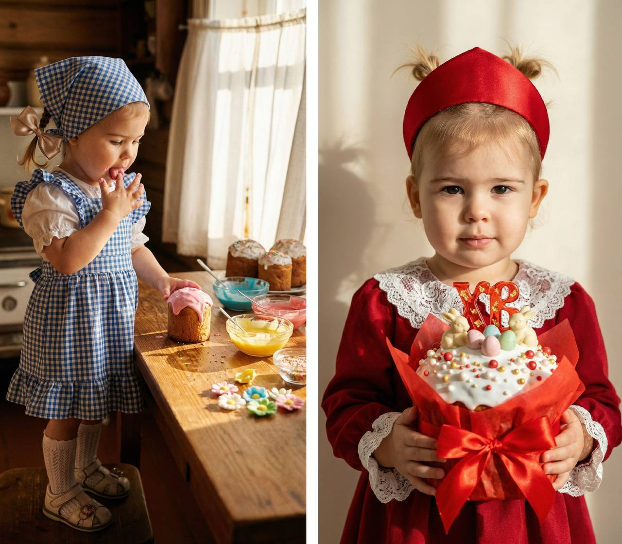 Кинематографический близкий портрет девочки с добавлением зерна Формат 9:16. На ней платье-фартук в бело-голубую клетку с оборками по подолу и пышными рукавами-фонариками. Под ним простая белая блузка. На ногах белые носочки с кружевом и кожаные сандалии. На голове повязанный сзади на бант платок в тон платью. Два аккуратных хвостика, украшенные атласными ленточками, завязанными пышными бантами. Светлая деревенская кухня. На деревянном столе миски с разноцветной глазурью, баночки с посыпкой, сахарные цветы и несколько уже готовых куличей. На заднем плане видна русская печь или старинный буфет. Девочка стоит на маленькой скамеечке, чтобы достать до стола. Она сосредоточенно, высунув кончик языка, украшает маленький кулич розовой глазурью. Палец одной руки измазан в глазури она уже пробует. Теплый, золотистый свет, льющийся из окна с белыми занавесками. Мягкие тени, подчеркивающие уют домашней выпечки.