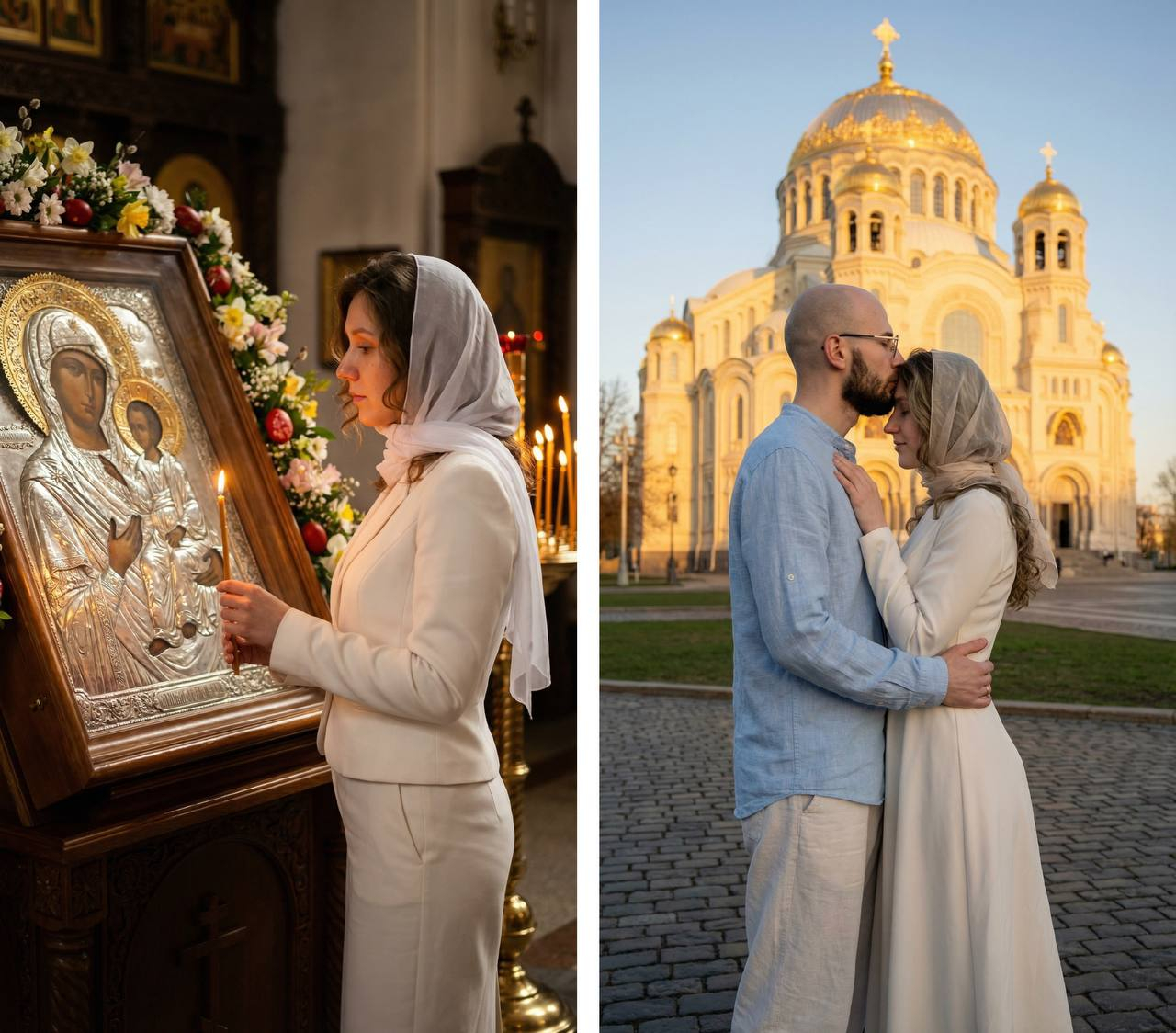 Создай портрет, не меняя черты лица. Кинематографичный снимок влюбленной пары, стоящей на площади перед величественным православным собором с золотыми куполами (ХРАМ ВС РФ). Крупный план кадра по пояс. Мужчина нежно целует женщину в лобо Оба одеты в светлую одежду, мужчина в светлых брюках свободных льняных, и голубой льняной рубашке, женщина в молочном платье длинном с длинным рукавом. Ее волнистые волосы покрывает полупрозрачный платок. Храм ярко подсвечен теплым золотистым светом, контрастирующим. Закатный свет. На земле виден тонкий слой травы, создающий атмосферу ранней весны Высокая детализация лиц, текстуры ткани и архитектуры храма, реализм, 8к. Кадр по пояс