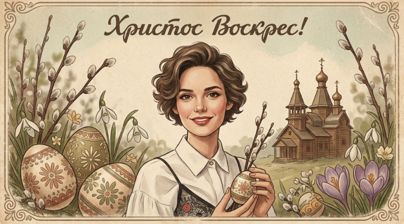 Используй загруженное фото и аккуратно перенеси внешность человека, сохранив узнаваемость (черты лица, пропорции, волосы), но мягко стилизуй под винтажную иллюстрацию без искажений. Создай винтажную пасхальную открытку в стиле ретро-иллюстраций середины XX века. Человек с фото интегрирован в композицию (по пояс или портрет). Фон: пасхальные символы — яйца с орнаментами, цветы, веточки вербы, на заднем плане может быть небольшой православный храм. Эффект состаренной бумаги: текстура, лёгкая зернистость, выцветшие цвета. Цветовая палитра: бежевые, коричневые, оливковые, приглушённые пастельные оттенки. Освещение мягкое, равномерное, без сильных контрастов. Стиль: ретро-иллюстрация, мягкие мазки, эффект старой печати, лёгкая типографская текстура. Добавить надпись в верхней части открытки калиграфическим шрифтом на русском языке: «Христос Воскрес!».