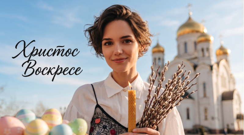 Используй загруженное фото и максимально точно сохрани внешность человека (черты лица, форма лица, цвет глаз, волосы, пропорции 1:1, без искажений и стилизации). Создай фотореалистичную православную пасхальную открытку. Человек с фото органично вписан в сцену (по пояс или крупный план), спокойное выражение лица, лёгкая тёплая улыбка. На переднем плане — зажжённые восковые свечи с мягким пламенем, веточки вербы с пушистыми почками, аккуратно разложенные пасхальные яйца в пастельных оттенках. На заднем плане — православный храм с золотыми куполами, мягкий утренний свет, лёгкая дымка, голубое небо. Композиция с глубиной: человек и передний план в фокусе, фон слегка размыт. Освещение тёплое, рассеянное, мягкие блики на коже и золоте куполов. Цветовая палитра: золотой, кремовый, светло-голубой, зелёный. Стиль: фотореализм, cinematic lighting, высокая детализация кожи и окружения, натуральные текстуры, без мультяшности. Добавить аккуратную каллиграфическую надпись на русском языке: «Христос Воскрес».