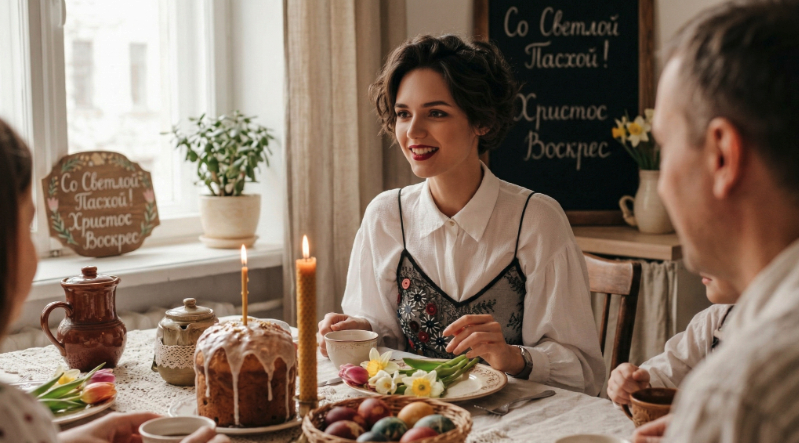 Используй загруженное фото и точно перенеси внешность человека (черты лица, пропорции, цвет кожи и волос 1:1, без искажений). Создай тёплую семейную пасхальную сцену: человек находится за праздничным столом в домашней обстановке. На столе — кулич с белой глазурью, крашеные яйца, свечи, посуда, текстиль. Композиция уютная: человек в центре или немного сбоку, ощущение “живого момента”. Дополнительно: букет весенних цветов или корзина с яйцами. Освещение — мягкое, тёплое, как от окна или лампы, создающее атмосферу дома и спокойствия. Лёгкие блики на посуде, мягкие тени. Цветовая палитра: кремовые, золотистые, пастельные оттенки. Стиль: фотореализм, уютная семейная фотография, высокая детализация, натуральные текстуры, без постановочности. Добавить надпись на русском языке красивым шрифтом: «Со Светлой Пасхой! Христос Воскрес».