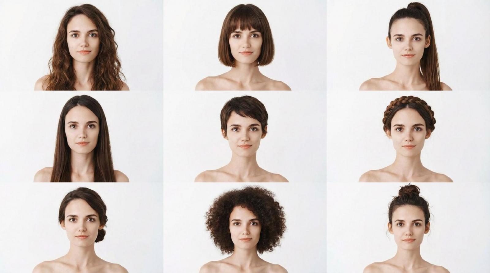 Покажи этого персонажа (приложенное фото) с 9 разными причёсками (сетка 3×3)