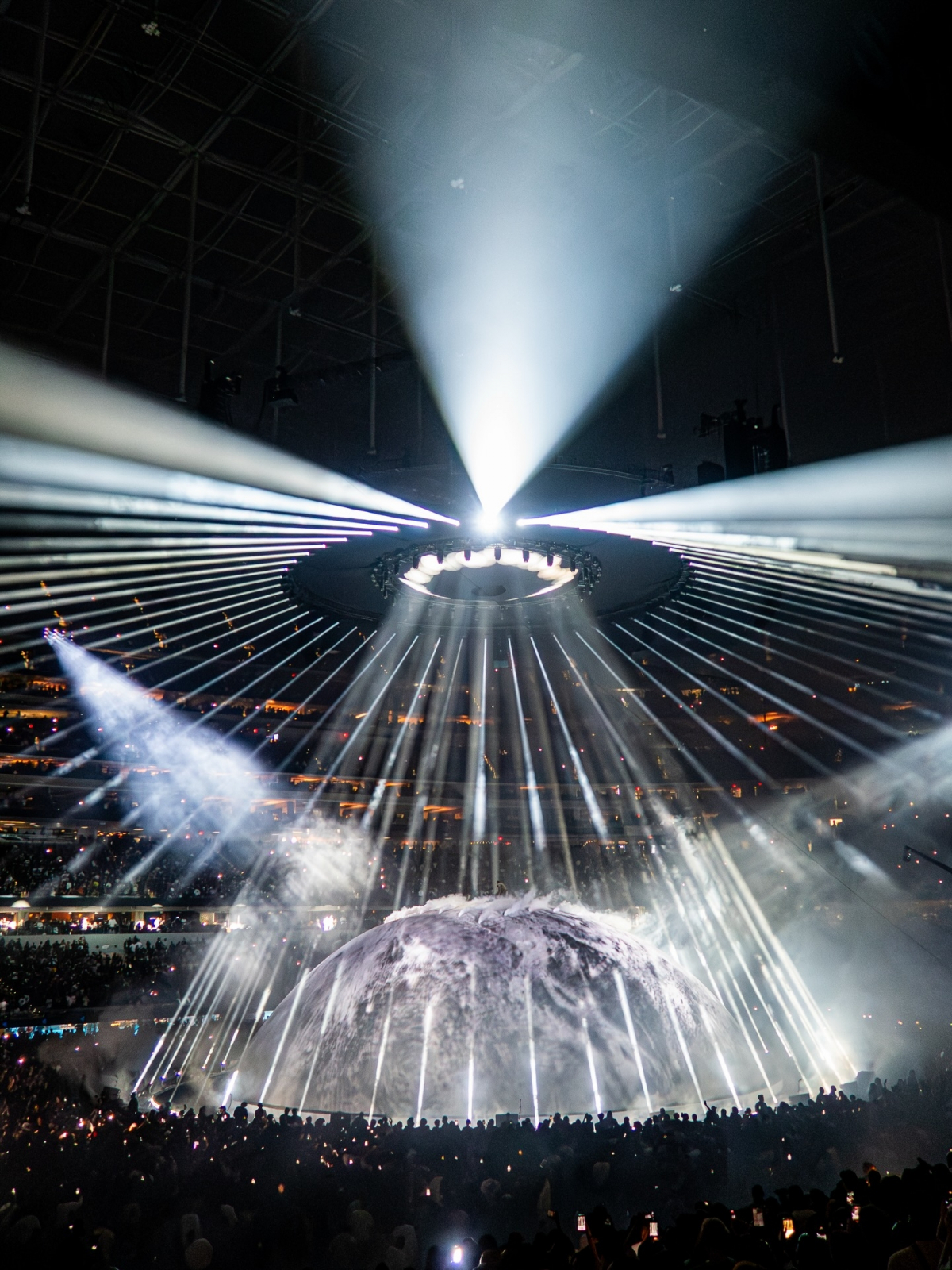 Первое — сцена как заявление. Сфера — сильный визуальный символ: от Земли до космоса. Это не просто декорация, а позиционирование артиста через пространство. Такой объект сразу становится контентом и точкой притяжения внимания.