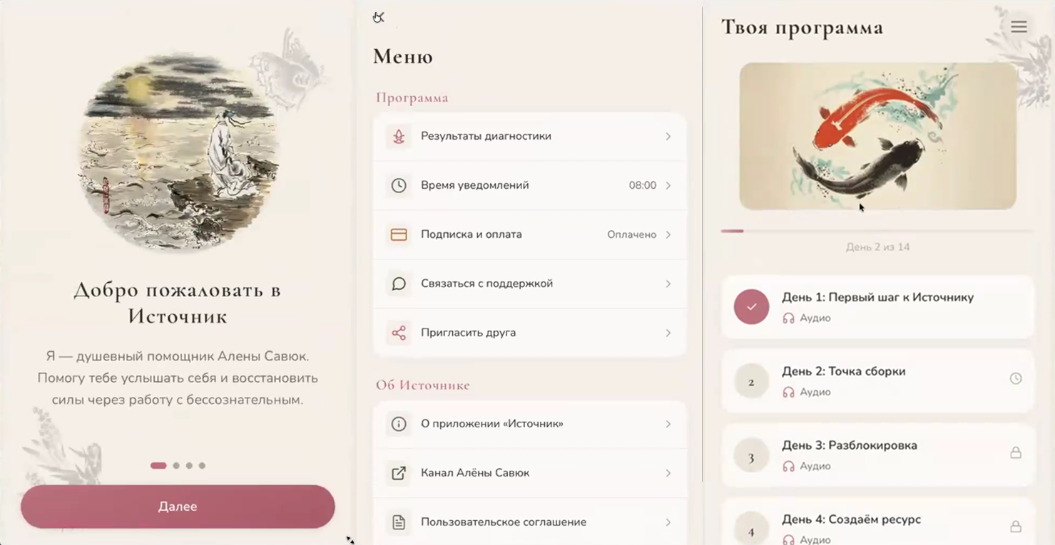 Что внутри: онбординг с диагностикой и персональным подбором программы, ежедневные практики с плеером и прогресс-барами, бонусные медитации, оплата через Робокассу (живые деньги, ни один платёж не потерялся), push-уведомления. Вся визуальная часть — дизайн от Claude Code (Frontend Design Skill), без дизайнера.