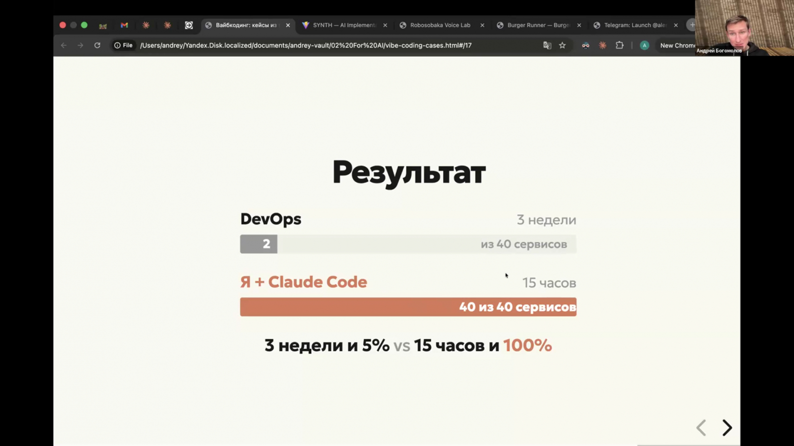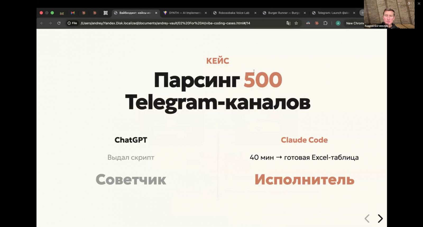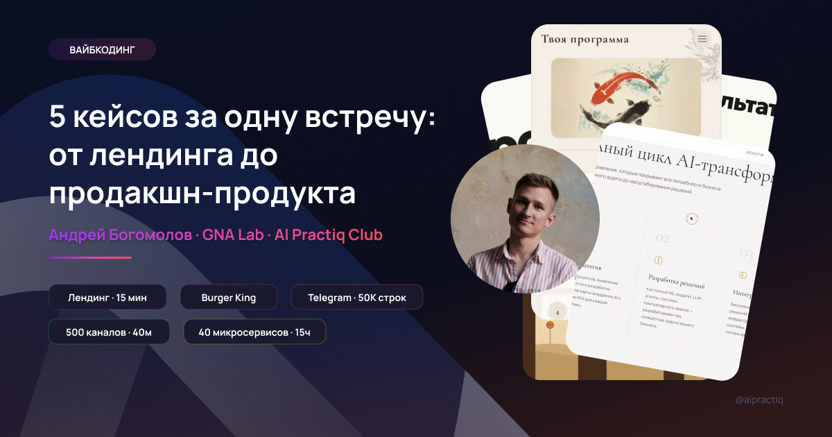В марте 2026 года Андрей пришёл на закрытую встречу AI Practiq Club и показал пять кейсов, каждый из которых сделан через вайбкодинг — без единой строчки кода, написанной вручную. Презентацию к встрече, кстати, тоже завайбкодил.