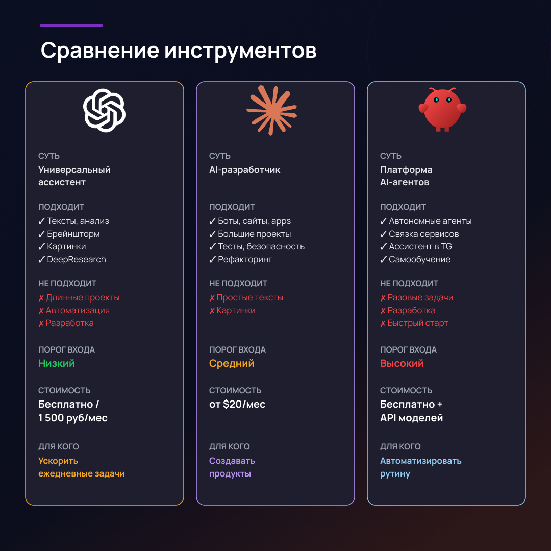 Когда выбирать: вы хотите создавать продукты - боты, дашборды, автоматизации, сайты. Не обязательно быть программистом, но нужно понимать, что вы строите.