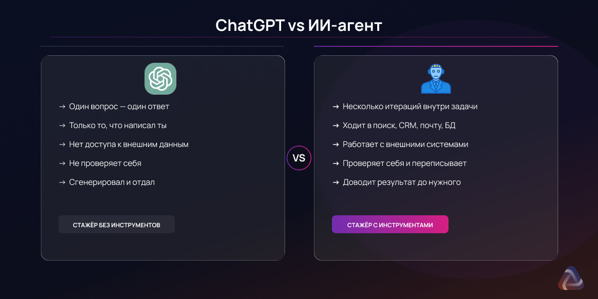 Условно: ChatGPT - это умный стажёр, который отвечает только по тому, что ты ему рассказал. Агент - тот же стажёр, но с доступом к рабочим инструментам и привычкой перепроверять свою работу.