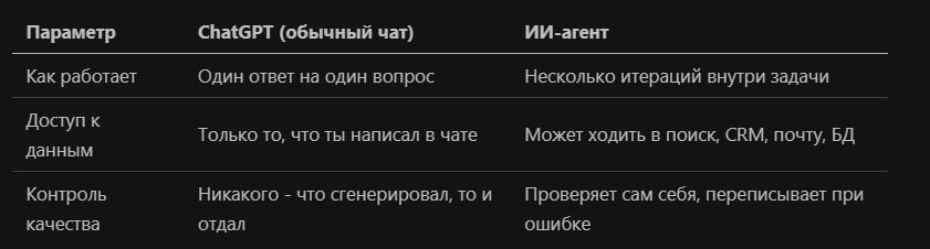 ИИ-агент работает так же. В этом вся разница между ним и привычным чатом.