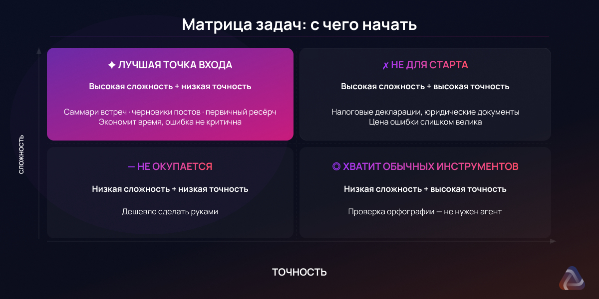 Практически это значит: начинай с задач, где агент экономит часы работы, а последнее слово остаётся за человеком.