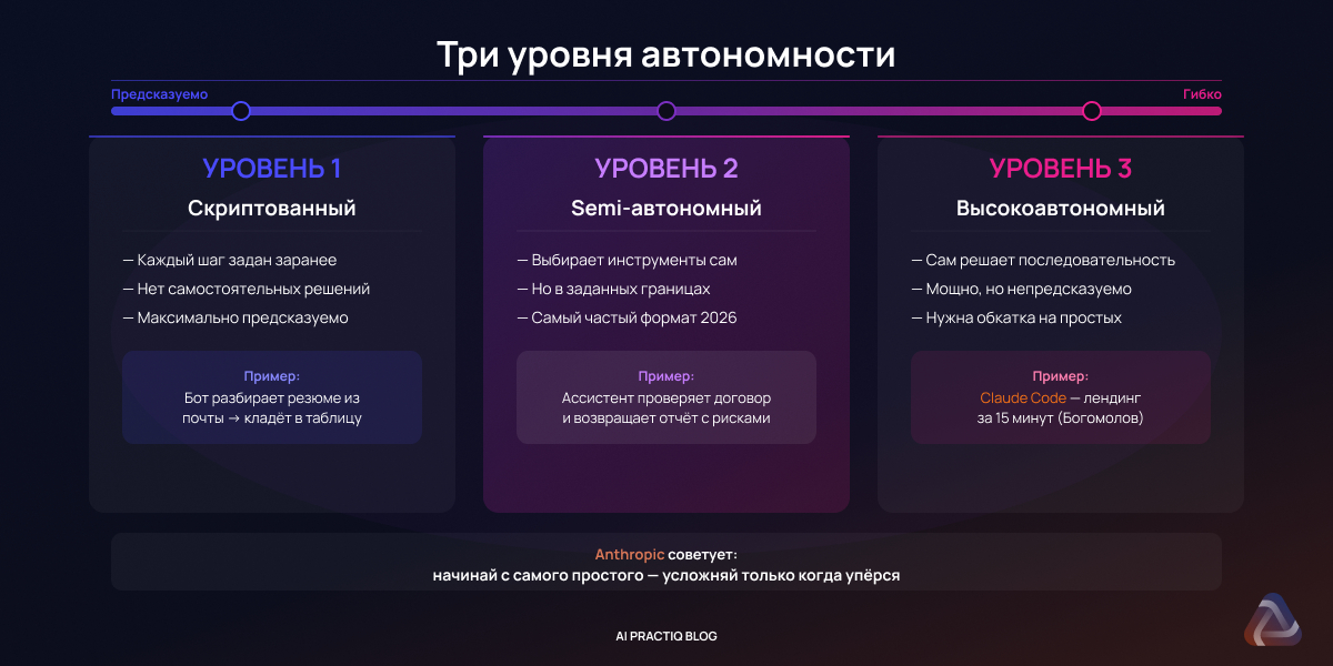 Слово "автономный" вокруг ИИ-агентов заездили до бессмысленности. На деле есть чёткий спектр, и выбор уровня напрямую влияет на цену ошибки.
