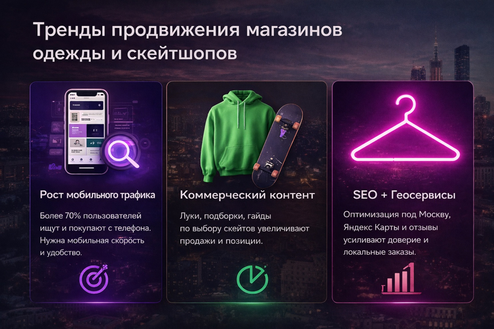 Тренды SEO-продвижения магазинов одежды и скейтшопов в 2026 году определяются изменениями алгоритмов Яндекса и поведением аудитории. Первый тренд — персонализация поиска на основе геолокации и истории запросов, что требует создания локальных посадочных страниц для районов Москвы с уникальным контентом. Второй тренд — рост значимости визуального контента: магазины одежды с качественными фото товаров в высоком разрешении и видеообзорами получают на 45% больше кликов из поиска. Третий тренд — голосовой поиск, который используют 28% пользователей мобильных устройств для запросов типа «купить скейтборд рядом со мной».