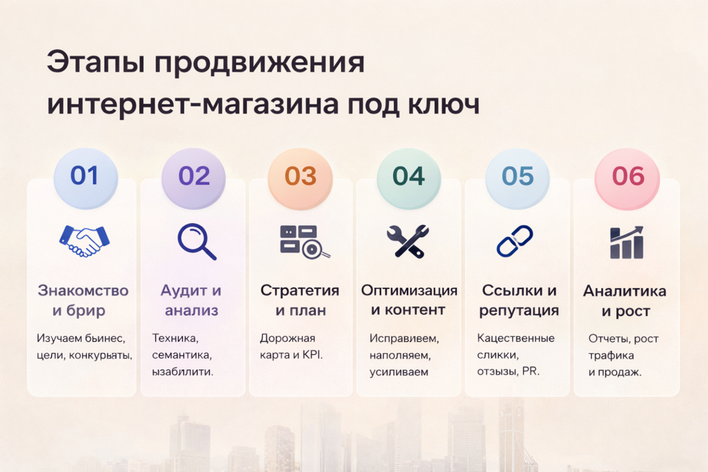 Этапы продвижения интернет-магазина включают пять последовательных фаз: технический аудит сайта, сбор и кластеризацию семантического ядра, внутреннюю оптимизацию, контент-маркетинг и наращивание ссылочной массы. Первый этап — технический аудит — занимает 1–2 недели и выявляет критические ошибки индексации, дублирование страниц, проблемы с скоростью загрузки и мобильной версией. Второй этап — сбор семантики — длится 2–3 недели и формирует ядро из 1000–5000 ключевых запросов с распределением по страницам каталога и карточкам товаров. Третий этап — внутренняя оптимизация — включает доработку структуры URL, мета-тегов, заголовков H1-H3 и внутренней перелинковки за 3–4 недели.