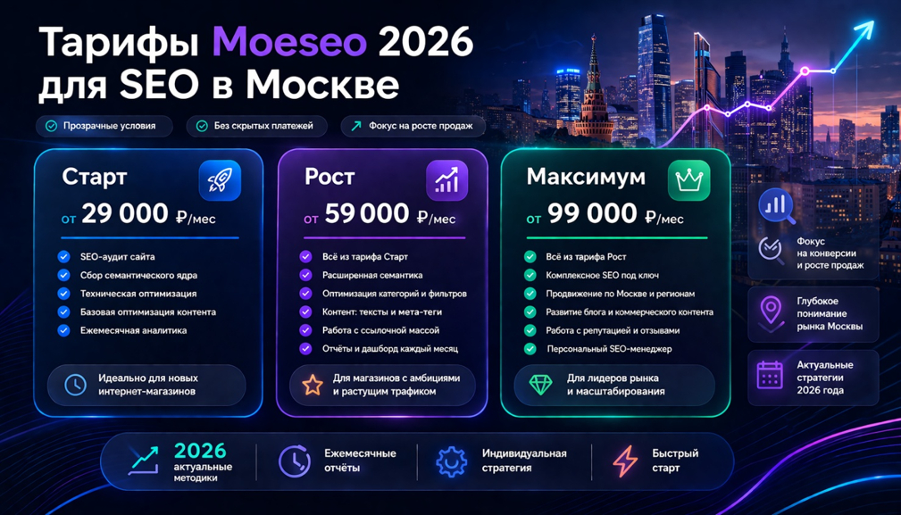 Тарифы Moeseo 2026 представлены тремя пакетами услуг под ключ для продвижения интернет-магазинов в Москве: «Старт», «Бизнес» и «Премиум» с ценами от 50 000 до 300 000 руб./мес. и гарантией роста трафика. Тариф «Старт» за 50 000 руб./мес. подходит для небольших магазинов с каталогом до 500 товаров и включает технический аудит, сбор семантического ядра до 500 запросов, оптимизацию 20 страниц в месяц и 2 статьи в блог. Тариф «Бизнес» за 120 000 руб./мес. рассчитан на средние интернет-магазины с 500–3000 товаров и предлагает семантику до 2000 запросов, оптимизацию 50 страниц, 4 статьи и наращивание 15 ссылок в месяц. Тариф «Премиум» за 300 000 руб./мес. для крупных проектов с 3000+ товаров включает полный цикл работ: семантику до 5000 запросов, оптимизацию 100+ страниц, 8 статей, 30 ссылок и персонального менеджера.