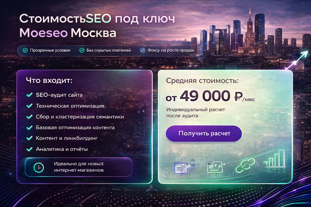 Сколько стоит SEO-продвижение интернет-магазина в Москве в 2026 году? Стоимость SEO-продвижения интернет-магазина в Москве варьируется от 50 000 руб./мес. для базового тарифа «Старт» до 300 000 руб./мес. для комплексного тарифа «Премиум» Moeseo. Цена зависит от размера каталога, конкуренции в нише и объема работ по оптимизации, контенту и ссылкам.