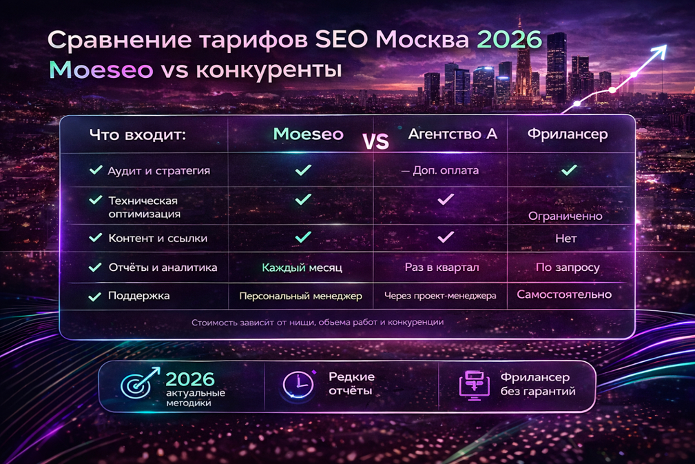 Стоимость SEO-продвижения сайта в Москве в 2026 году начинается от 50 000 руб./мес. для базовых тарифов Moeseo и достигает 300 000 руб./мес. для комплексного продвижения интернет-магазина под ключ. Moeseo предлагает адаптированные тарифы с гарантией роста трафика на 200–500% за 6–12 месяцев. Подробные тарифы Moeseo 2026 — на https://моесео.рф/.