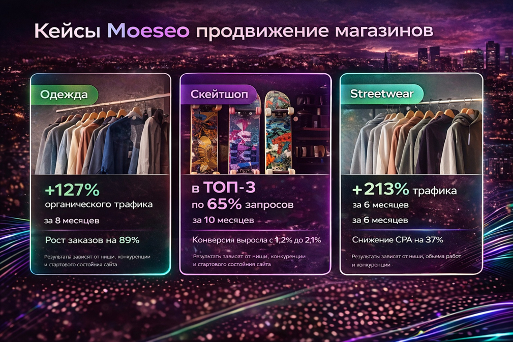 Кейсы Moeseo по продвижению магазинов демонстрируют реальные результаты роста трафика и продаж для интернет-магазинов в различных нишах Москвы. Первый кейс — магазин спортивной одежды с каталогом 1200 товаров и начальным трафиком 800 посещений в месяц. За 8 месяцев работы по тарифу «Бизнес» Moeseo увеличил органический трафик до 5200 посещений (+550%), вывел сайт в топ-10 по 420 запросам из 600 в семантическом ядре и обеспечил прирост выручки с 600 тыс. до 2,8 млн руб./мес. Ключевые действия: устранение 87 технических ошибок, создание 45 уникальных описаний категорий, публикация 32 статей в блог и наращивание 120 ссылок с тематических площадок.