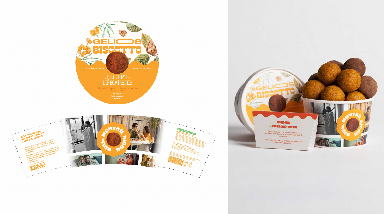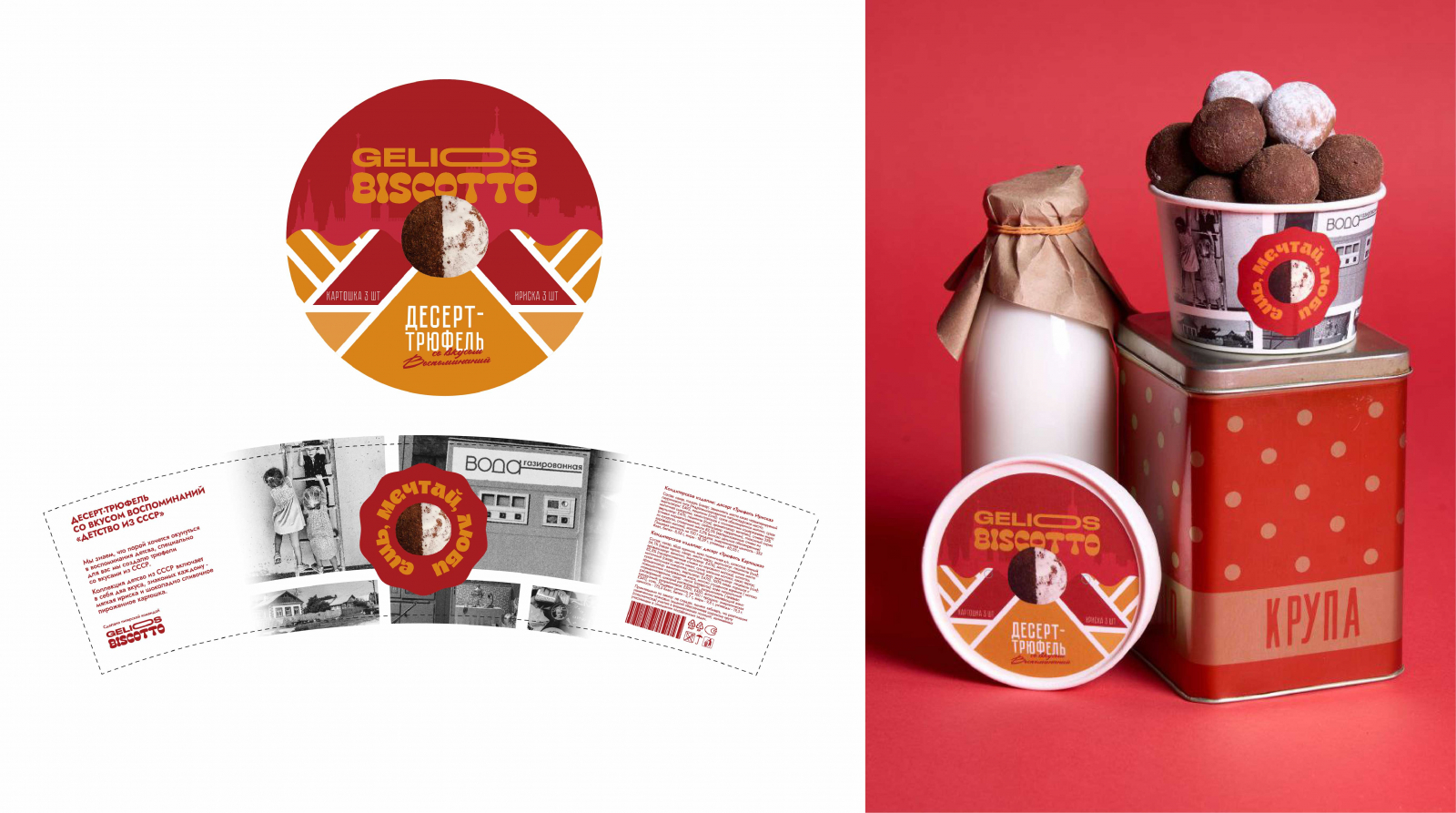 Логотип «GELIOS BISCOTTO» выполнен крупным, выразительным шрифтом, сразу привлекающим внимание.