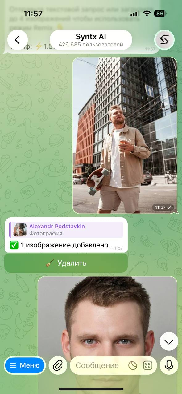 Теперь открываем Nano Banana Pro в SyntxAi. Отправляем два изображения: