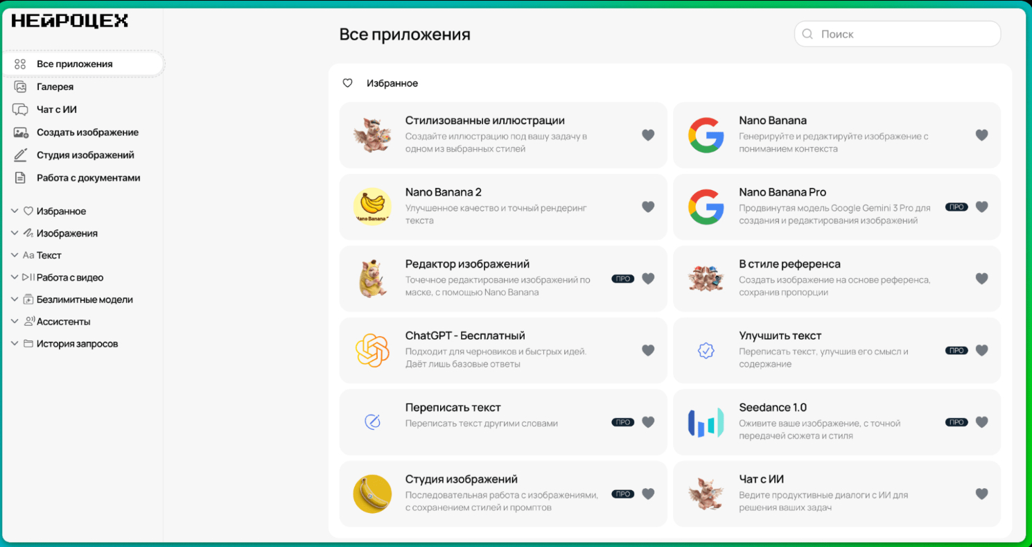 Нейроцех — агрегатор нейросетей, через который можно работать с популярными AI-моделями без иностранной карты. Внутри доступны текстовые модели ChatGPT, Claude, Gemini и Grok, генераторы изображений Nano Banana и OpenAI Image, а также видеогенераторы Kling, Veo и Seedance.