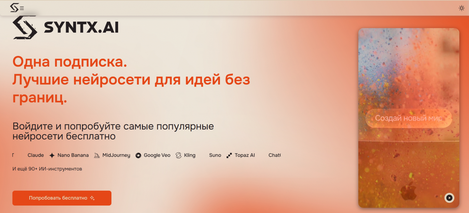 Syntx — один из агрегаторов, который собирает популярные AI-модели в одном сервисе. Через него можно работать с текстовыми моделями, генераторами изображений и видео без необходимости регистрироваться в каждом сервисе отдельно.